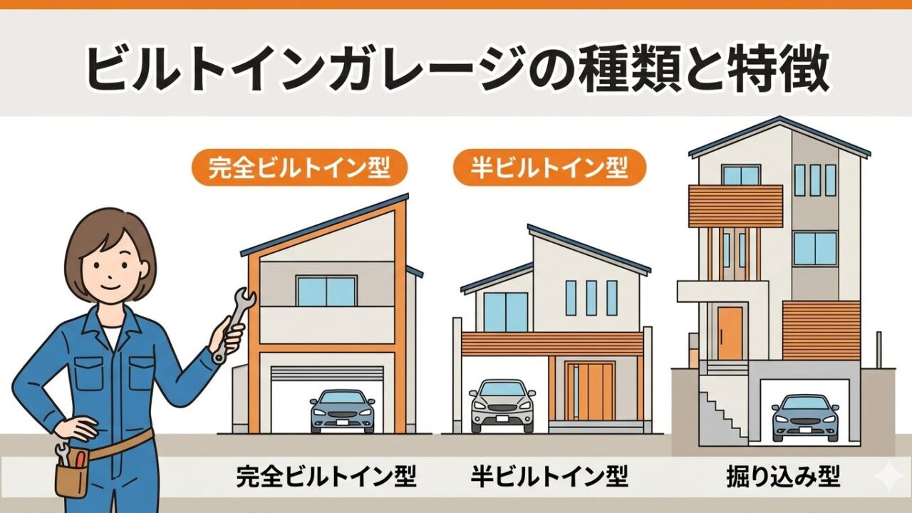 | 完全ビルトイン型 | 1階全体〜一部をガレージに使用。上階に居住スペース | 都市部の狭い敷地、2〜3階建て |