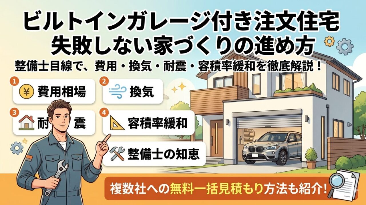 整備士時代の感覚で言うと、ビルトインガレージは「居住空間と車が同じ建物に同居する」構造だ。つまり、排気ガス・騒音・油分・湿気の管理が、カーポートや独立ガレージより格段にシビアになる。これを設計段階でちゃんと織り込んでいるかどうかが、ハウスメーカーの実力差として出てくる部分でもある。
