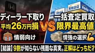 過去の記事でも再三警告しているが、ディーラーの下取りは、中古車買取専門店の【買取】に比べて、平均して16万円〜26万円も安く買い叩かれるという残酷なデータが出ている。