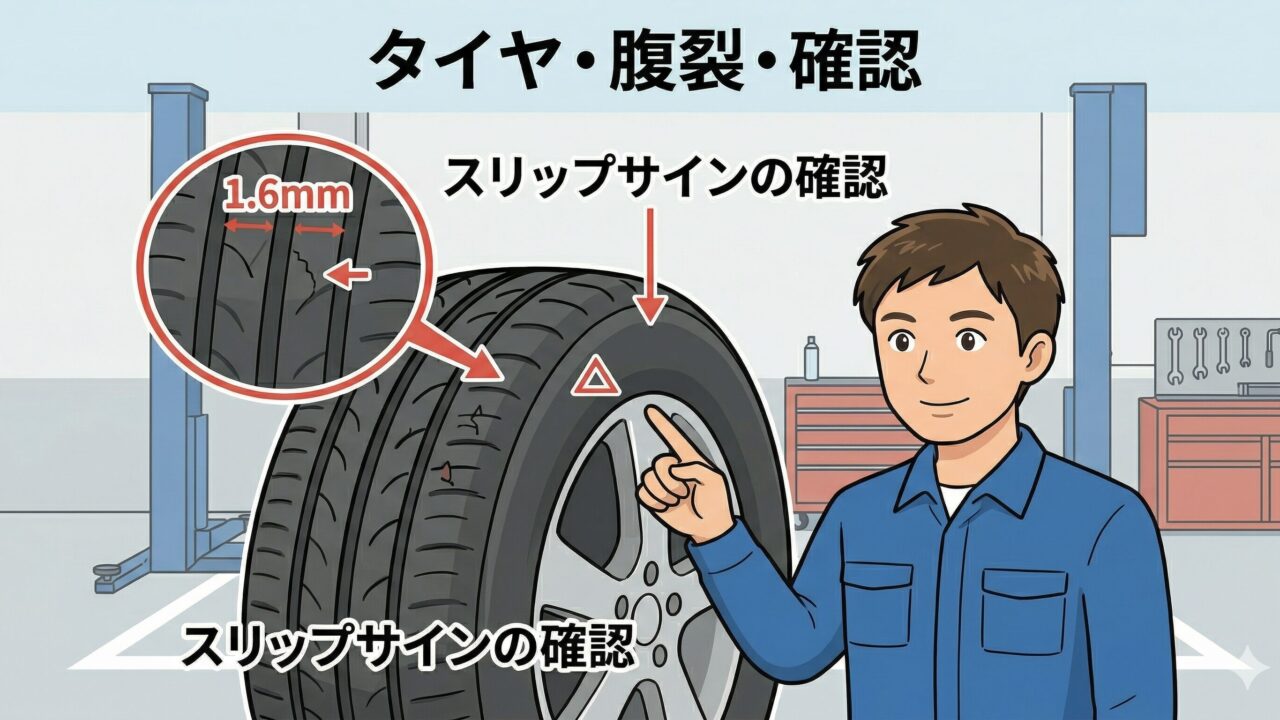 1. タイヤの溝とひび割れ(スリップサインの確認)