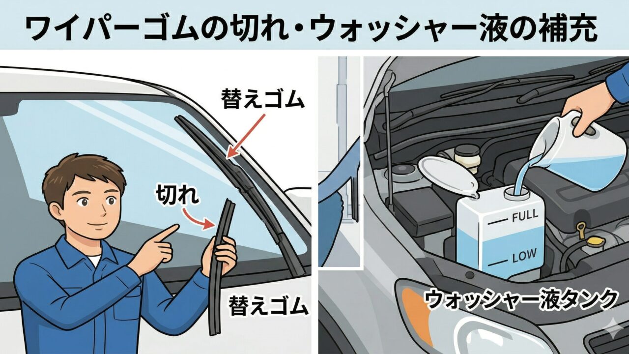 ワイパーのゴムが切れていたり、拭き取り時にスジが何本も残るような状態だと、「視界不良」とみなされて車検に通りません。また、ウォッシャー液が出ない(タンクが空になっている)状態もNGです。